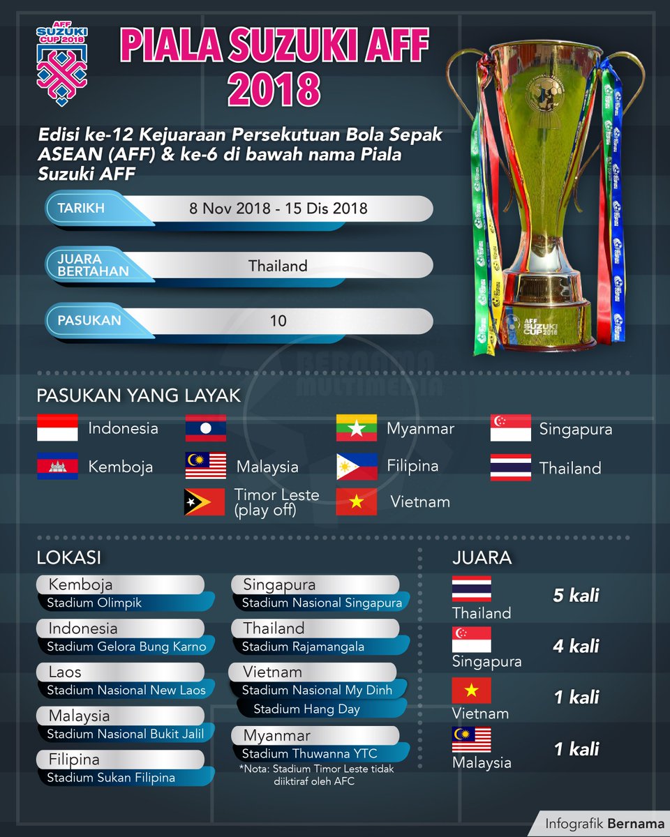 Piala malaysia2018 bermula dengan pusingan awal. Berikut dikongsikan info piala aff suzuki 2018. Manakala kumpulan b bakal menemukan juara piala aff suzuki 2016 thailand, singapura indonesia, filipina dan juga brunei atau timor leste. Berikut adalah jadual dan keputusan perlawanan piala aff suzuki 2018 yang melibatkan pasukan malaysia sebagai panduan buat rakyat malaysia See more of piala aff suzuki 2018 on facebook.